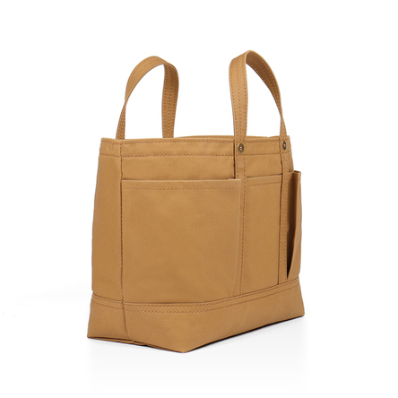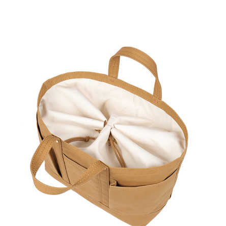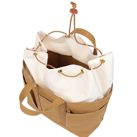 素材: 綿帆布 物の出し入れがしやすいよう、とにかく口元が大きく開くデザイン。口元をしっかり閉じたいという声にも応え、その広い口元を巾着のようにキュッと絞って開け閉めする仕様にしました。たくさんの物を入れても大丈夫なように、底を二重に補強し、あえて太い糸で縫っています。容量が大きい分、かばん本体が少しでも軽くなるように工夫しました。外側に4つもあるポケットは、すぐに取り出したい携帯電話や定期入れを分けて収納するのに便利。さらに貴重品はかばんの内側のポケットに入れられるので、安心です。A4ファイルが横向きに入ります。